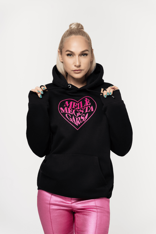 Džemperis „Meilė mėgsta garsą“ juodas su kapišonu 2